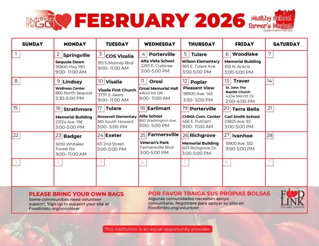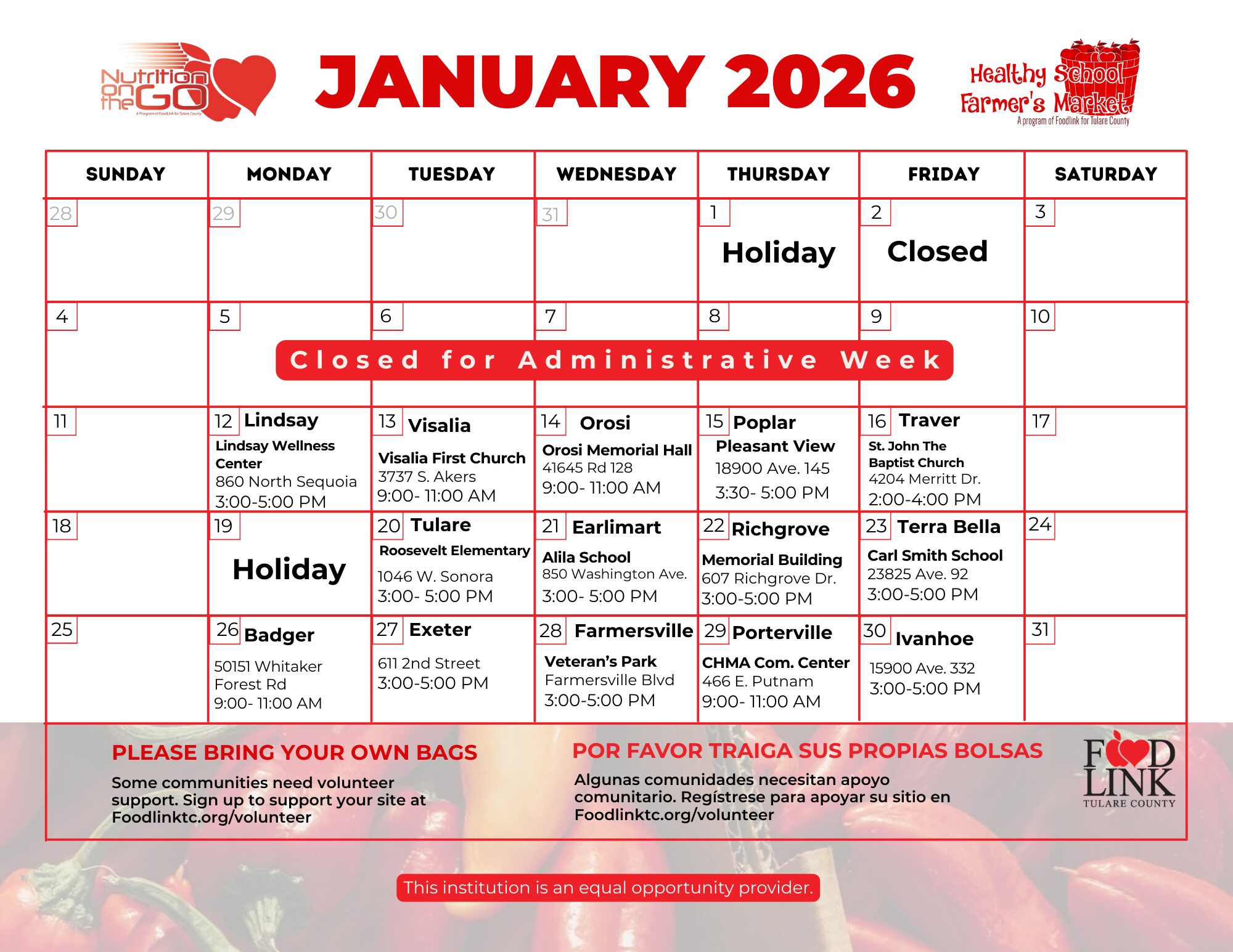 TENGA EN CUENTA: El calendario puede cambiar inesperadamente debido a factores fuera de control, como inclemencias del tiempo (calor/frío o lluvia), problemas con el equipo o cambios de sitio. Sigan a FoodLink en redes sociales para actualizaciones.
