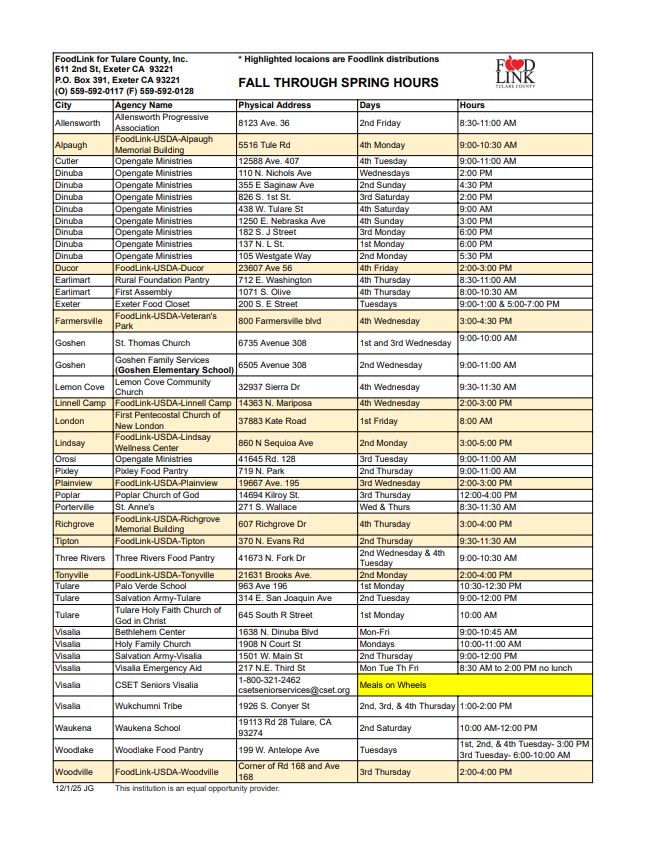 Dias de distribución del Condado de Tulare, CA | Tulare County, CA Distribution Schedule