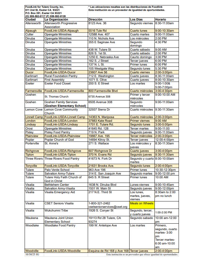 Lugares de distribución del Condado de Tulare, CA | Tulare County, CA Distribution Locations